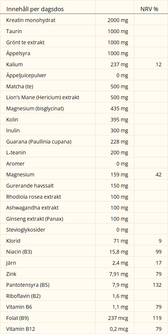 Kreatin monohydrat, Taurin, Grönt te extrakt, Äppelsyra, Kalium, Äppeljuicepulver, Matcha (te), Lion’s Mane (Hericium) extrakt, Magnesium (bisglycinat), Kolin, Inulin, Guarana (Paullinia cupana), L‑teanin, Aromer, Magnesium, Gurerande havssalt, Rhodiola rosea extrakt, Ashwagandha extrakt, Ginseng extrakt (Panax), Stevioglykosider, Klorid, Niacin (B3), Järn, Zink, Pantotensyra (B5), Riboflavin (B2), Vitamin B6, Folat (B9), Vitamin B12